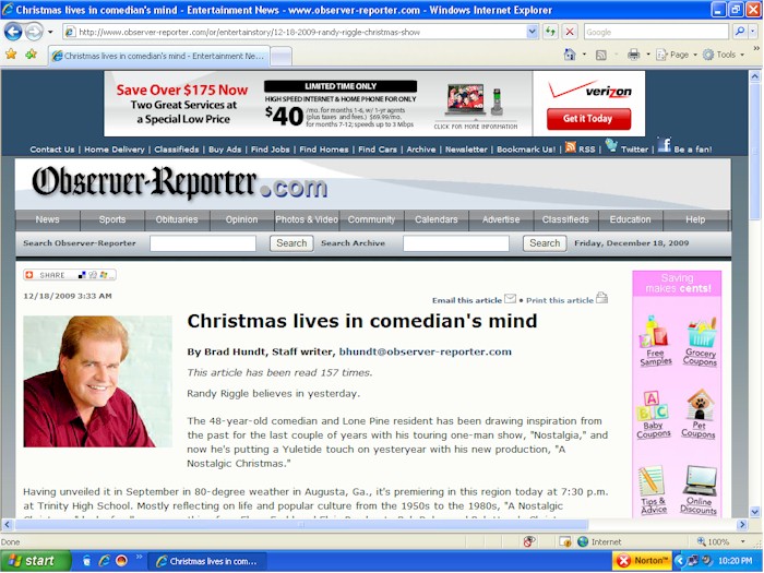 Christmas lives in comedian's mind12/18/2009 3:33 AMRandy Riggle believes in yesterday. The 48-year-old comedian and Lone Pine resident has been drawing inspiration from the past for the last couple of years with his touring one-man show, "Nostalgia," and now he's putting a Yuletide touch on yesteryear with his new production, "A Nostalgic Christmas." Having unveiled it in September in 80-degree weather in Augusta, Ga., it's premiering in this region today at 7:30 p.m. at Trinity High School. Mostly reflecting on life and popular culture from the 1950s to the 1980s, "A Nostalgic Christmas," looks fondly on everything from Elmer Fudd and Elvis Presley to Bob Dylan and Bob Hope's Christmas specials. "I've been in the Christmas spirit since July, since I started writing the show," Riggle explained. Everyone always talks about the best Christmas they ever had, whether it was based on some event or some gift, Riggle explained, and "A Nostalgic Christmas" tries to summon those memories. The comedian uses impersonations to evoke the famous and not-so-famous, and also dances, pays tribute to veterans and is backed by a multimedia slide presentation. Riggle's favorite Christmas memory? He has a couple: His father taking him up the street from his house on Christmas Eve to look at lights and "missing" Santa Claus' visit to his house; and, later on, his father taking him to downtown Washington, giving him $5 and trusting him to meet him back at a certain spot in a few hours. He spent the $5 on baseball cards. "That's the best Christmas I ever had," Riggle said. Having launched his career at an open-mic night in Pittsburgh 27 years ago, Riggle has appeared many times in Las Vegas and tours extensively, appearing at a variety of public and private events. He's opened for Jerry Seinfeld and Ellen Degeneres, among others, and has written for Jay Leno and Joan Rivers. After the Trinity High School performance, Riggle will taking "A Nostalgic Christmas" to Miami. He might dust it off for a "Christmas in July" run over the summer in between performances of his regular "Nostalgia" show. He's also working on a book and cooking up a "Vintage Vegas" show built around Las Vegas's "Rat Pack" glory days. Copyright Observer Publishing Co.